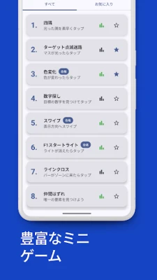 あなたの脳に挑戦する、多様な認知トレーニングモードが満載です。まるでレーシングドライバーになったかのようにスタート合図に反応する「F1スタートライト」で瞬発力を磨き、表示された文字と色の不不一致を瞬時に判断する「色当て」で情報処理能力を極限まで引き出します。また、動き続けるターゲットを正確に捉える「動くボール」は、目と手の協応を徹底的に鍛え上げます。これらユニークなゲームは、単一のスキルだけでなく、多角的な視点からあなたの集中力と判断力を刺激し、総合的な脳のワークアウトを提供します。他にも数多くのモードが、常に新鮮な挑戦を約束します。