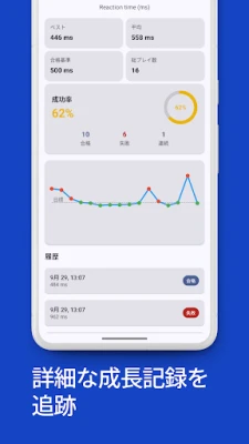 進捗は「反応速度テスト&反射神経を鍛える集中力脳トレゲーム」の詳細な統計機能で明確に可視化されます。各モードのベストタイムや平均スコアはもちろん、プレイ履歴全体を通じて、あなたの成長の軌跡がグラフとして客観的に記録されます。これにより、自身の得意分野と改善点を把握し、目標達成への具体的な道筋を描くことが可能です。この継続的なフィードバックは、集中力、注意力、そして脳全体の敏捷性を高める確かな原動力となるでしょう。シンプルなデザインは余計な要素を排除し、あなたがトレーニングに完全に没頭できる環境を作り出し、最大限の集中を促します。